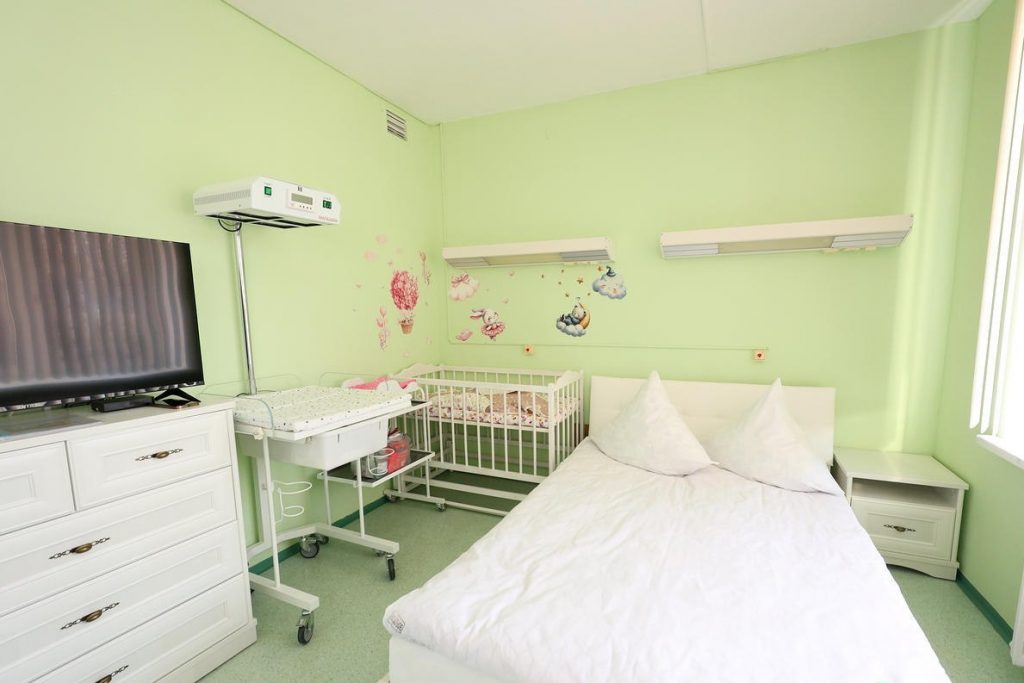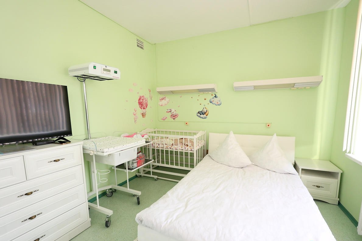Палата включает в себя диван, двухспальную кровать, прикроватную тумбочку, комод, шкаф, стол, телевизор, холодильник, СВЧ-печь, чайник, набор столовой посуды.  Для новорожденного есть кроватка и пеленальный столик.